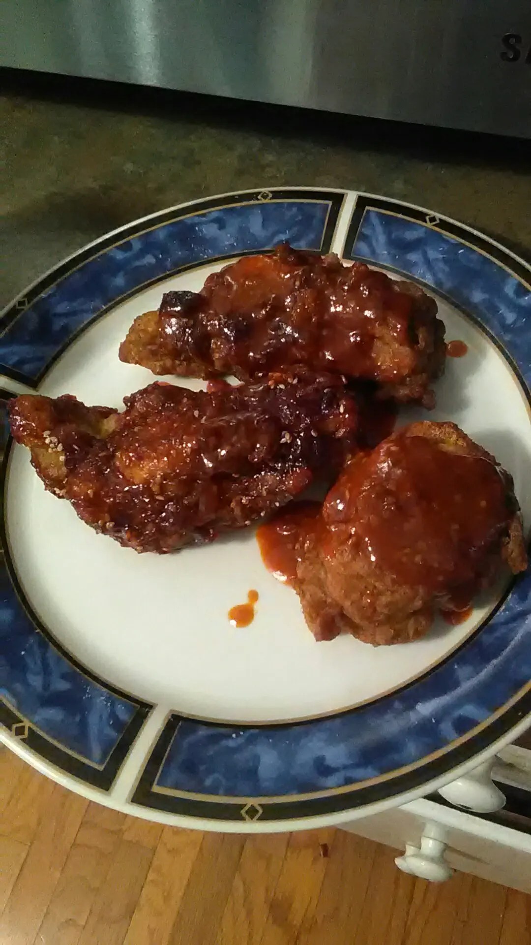 We had Korean fried chicken with a spicy sauce.