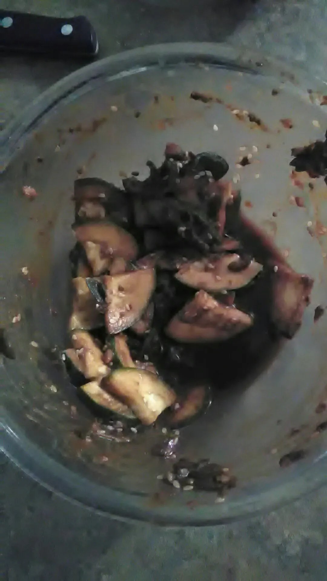 Zucchini in a doenjang (miso) sauce with chili peppers.