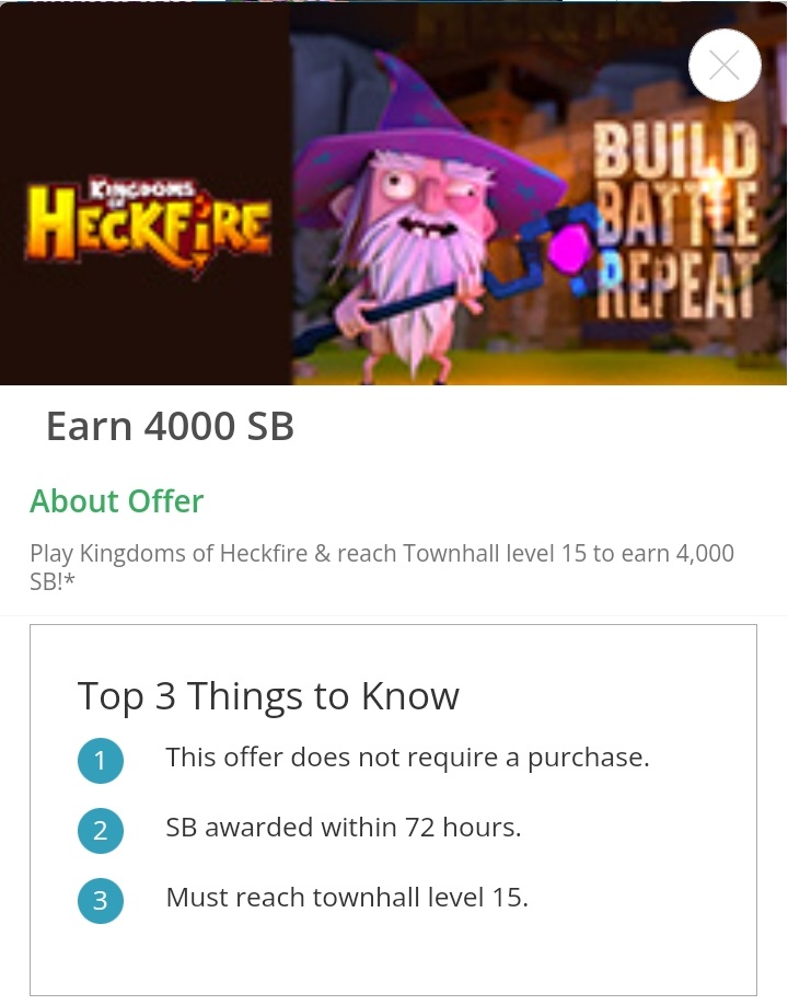 Kingdoms of Heckfire is being offered on Swagbucks for a 4,000 SB reward. The offer was in my Inbox but I also see it in the Search option. Offer terms are to reach Castle level 15, with no time limit listed on the offer.