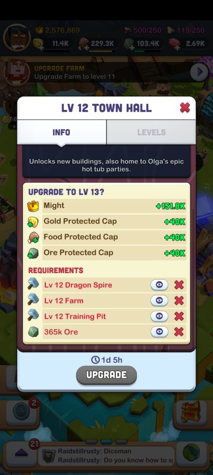 The Castle construction time started to get fairly long at level 13. The time to upgrade extended to over 1 day, the prerequisite buildings also took 9+ hours and I had to do them 1 at a time without a 2nd builder slot.