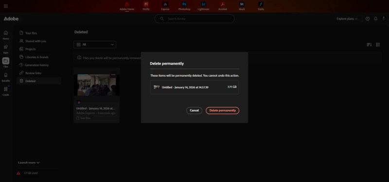 The red bar remained in place after permanently deleting the files, and the overage amount (7.71GB) did not change.