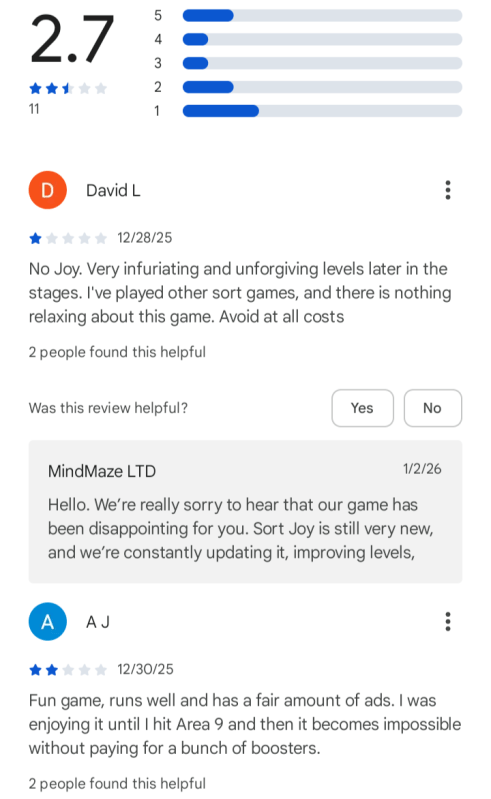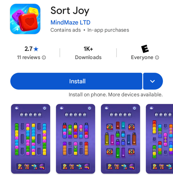 Title page for mobile game "Sort Joy," published by MindMaze LTD.