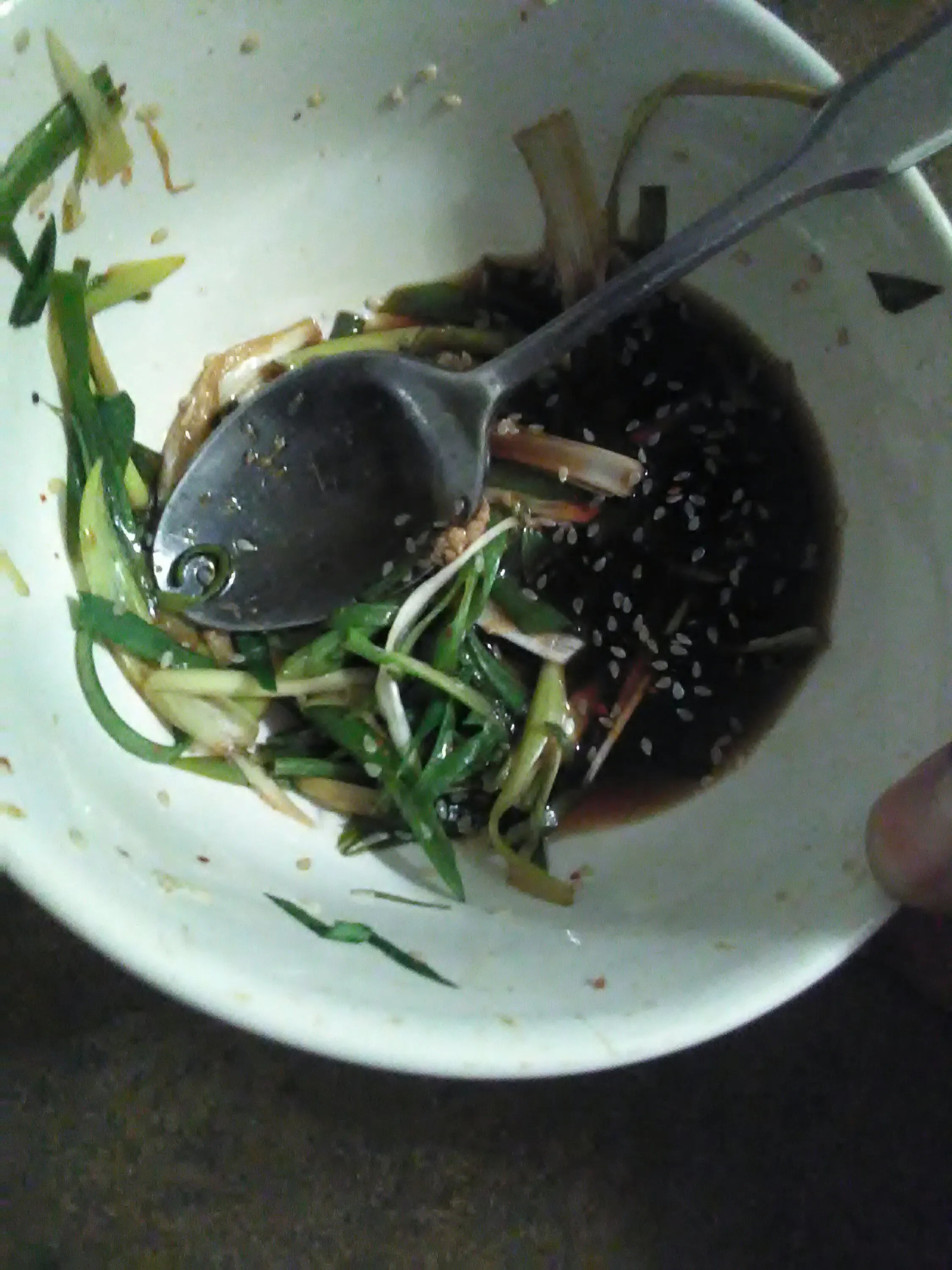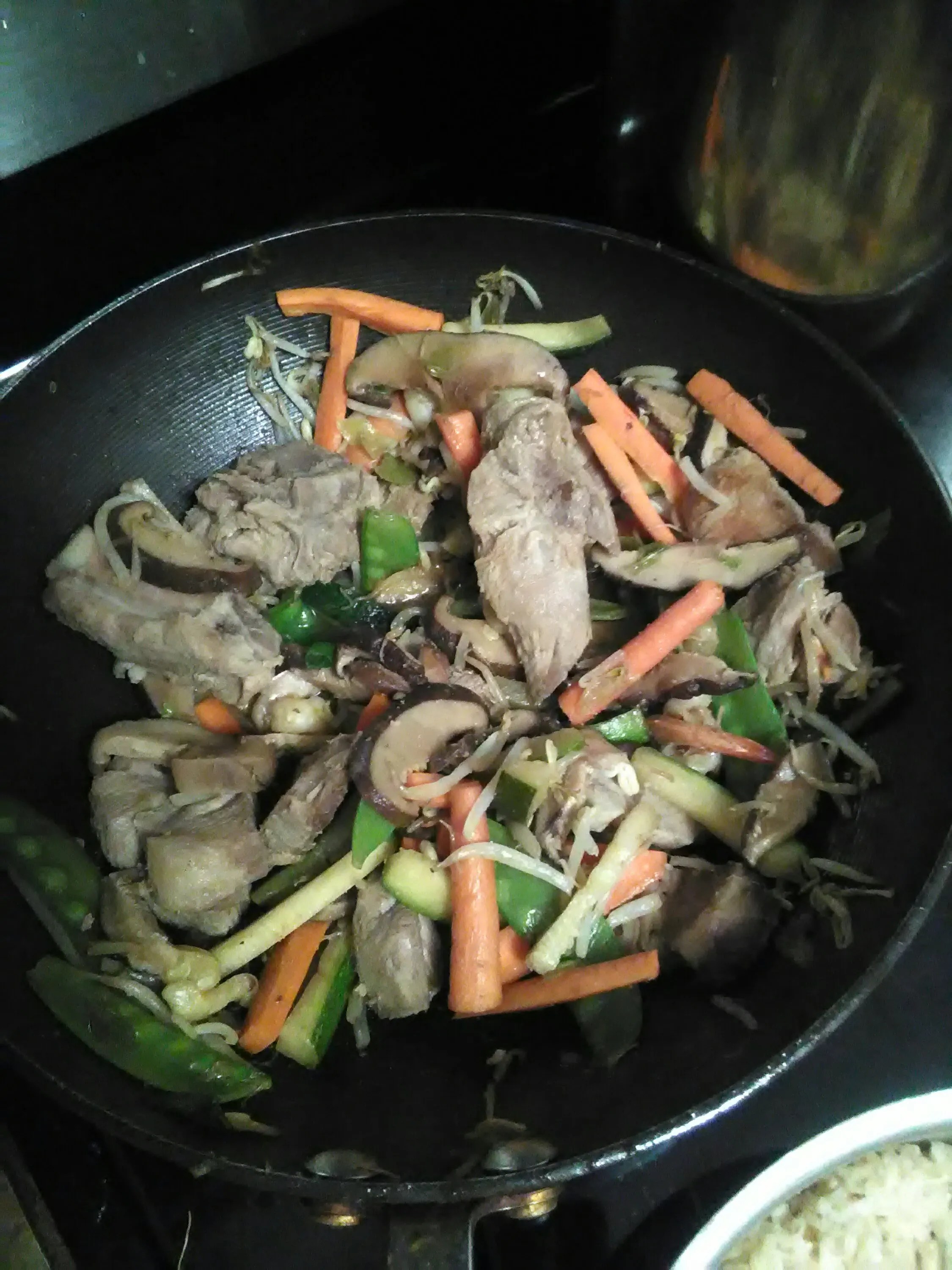 Dinner tonight is stir-fried veggies with pork and brown rice. A dipping sauce made from soy sauce, sesame seeds, honey, and red pepper flakes.