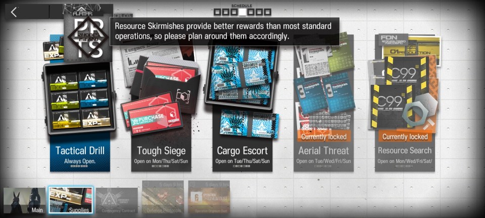 Operators for hireDaily Login BonusOperators for recruitmentDaily MissionsRecruitment optionCampaign trailSide MissionsBase Construction