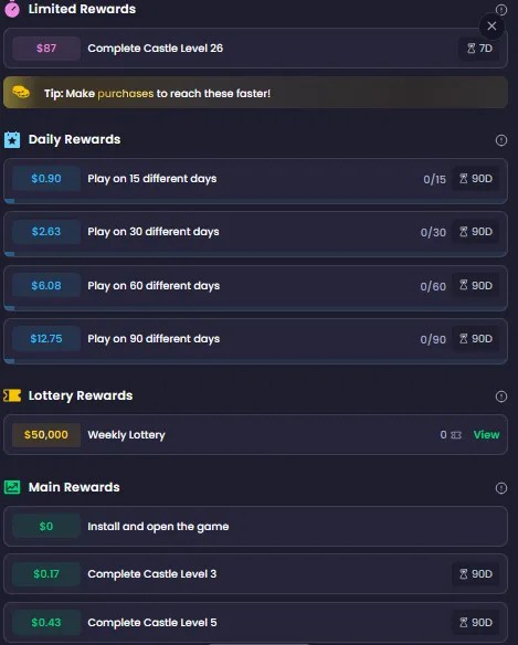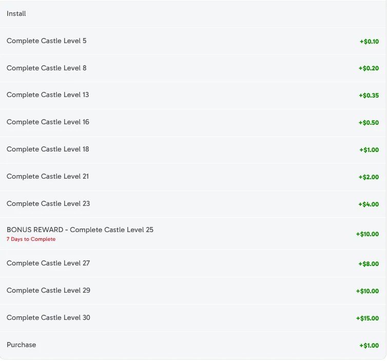 The offer is pretty straightforward though the time limit is short. A Reddit user had posted that it took 2.5 hours to complete the offer so I jumped in. I’m sitting at 9 hours played and still only at level 12. I get maybe 175-200 experience points per game while playing the 4-card bingo at the Excalibur location. That is 15% of the level-up bar on experience points. It will probably take a few days to complete the offer so long as the numbers don’t change.