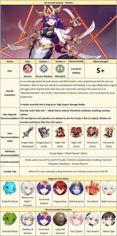 ▶ Target at least 5-Star. Most SSR Luminaries reach 5-Star when acquired. If you want to run a favorite that’s below SSR, raise it to 5-Star or higher first, otherwise its stat line won’t keep up. For SSR Luminaries and above, once the class balance noted earlier is in place, prioritize higher-star options. A 5-Star Legendary needs one duplicate to reach 6-Star. From 6-Star, you can consume fodder Luminaries to advance to Purple 1-Star. Reaching 6-Star typically unlocks a noticeable Core Talent boost, and Purple 1-Star delivers a clear stat bump. Aim to hit these tiers early, they provide a clean, high-impact power spike.