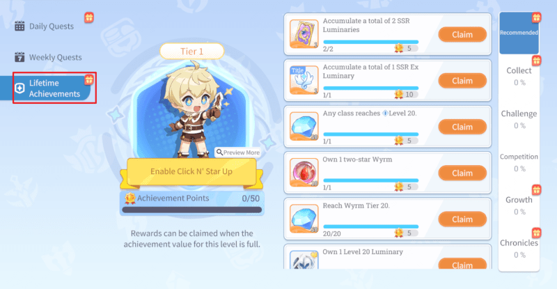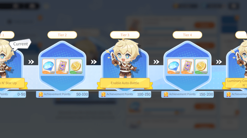 Lifetime Achievements are one-time milestones with lots of categories. Same as daily quests on Day 1, you’ll clear most of them simply by unlocking modes and pushing progression. Hitting certain achievement-point thresholds unlocks long-term features (One-Tap Star Upgrade, Auto-Battle, etc.) or grants abundant rewards (Summon Tickets). It is best to prioritize completing Lifetime Achievements. Aim to reach Lv.3 on Day 1 to unlock Auto-Battle.