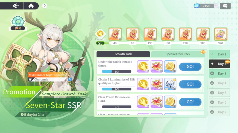 Brave Journey rewards are also very generous. You can upgrade the Epic Luminary “Forest Lord” Oberonnie into the SSR Luminary Midsummer Night’s Dreamer – Oberonnie. This strong frontline Guardian that reliably carries the early-mid game. Later rewards include Legendary Treasure componets that provide a clear stat boost, which is worth completing for every new player.