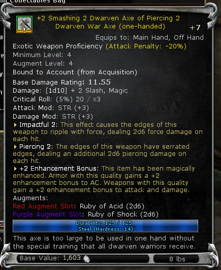 +2 Smashing 2 Dwarven Axe of Piercing 2, with Ruby of Acid (2d6) and Ruby of Shock (2d6), Minimum Player Level 4. Base Damage Rating: 11.55 [1d10]+2 Slash, Magic, (Pierce).