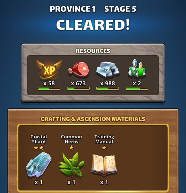 The chest on the main screen can be tapped to claim current accumulated rewards which include gold, wood, stone, exp tomes, and hero tokens.