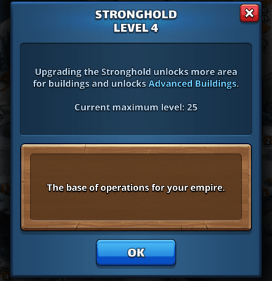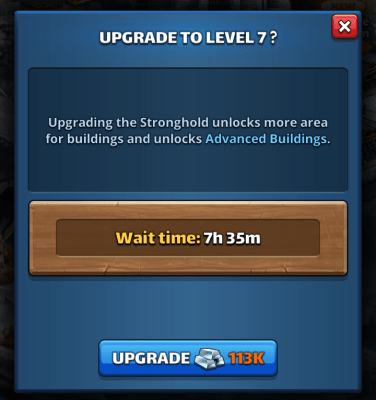 Upgrading the castle from 8 (town) to 16 (citadel) takes 385 hours or 16 days. You will need 6,072,100 Gold and Wood, and 2,507,790 Stone to complete the upgrades to the main building alone.