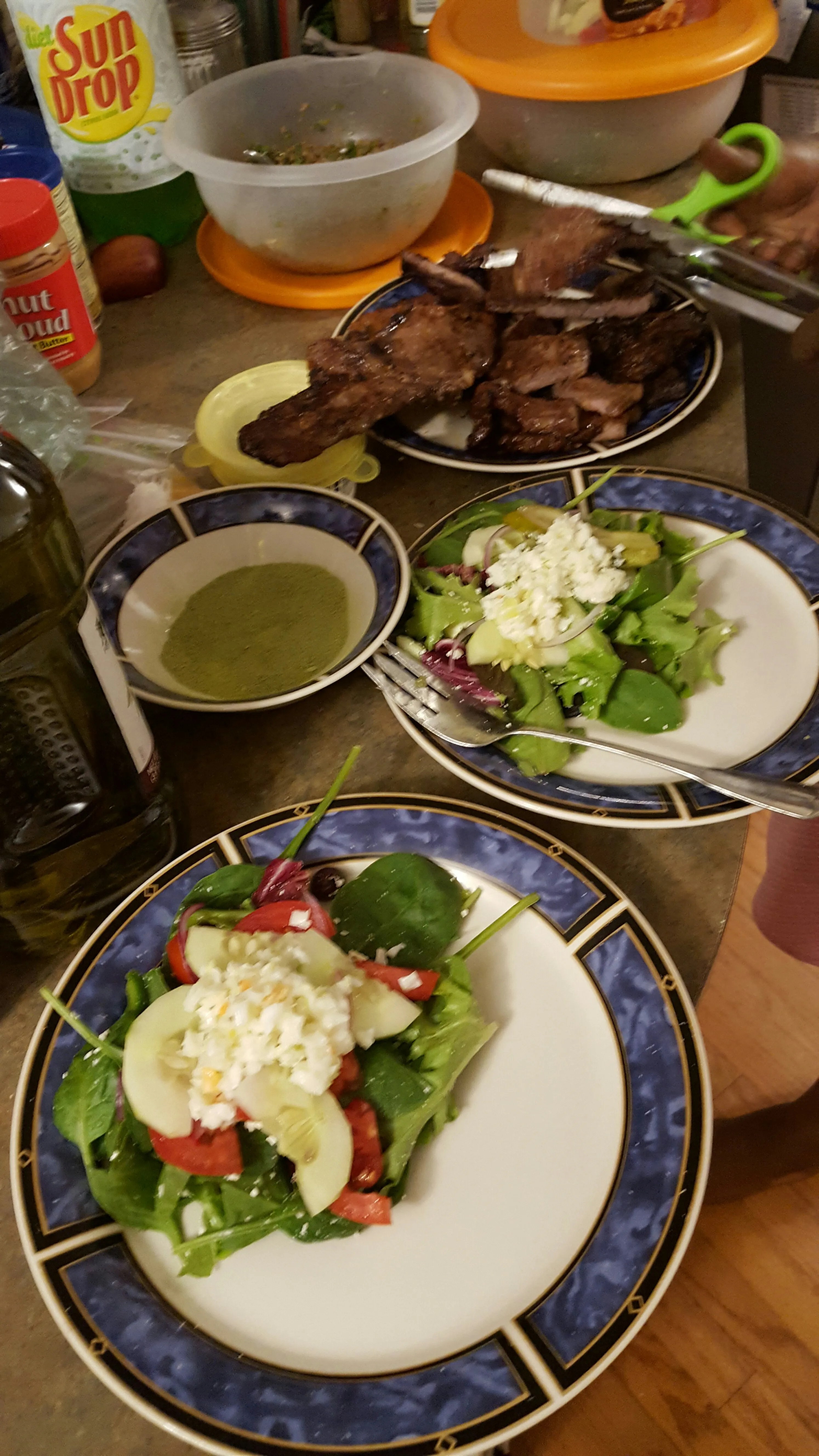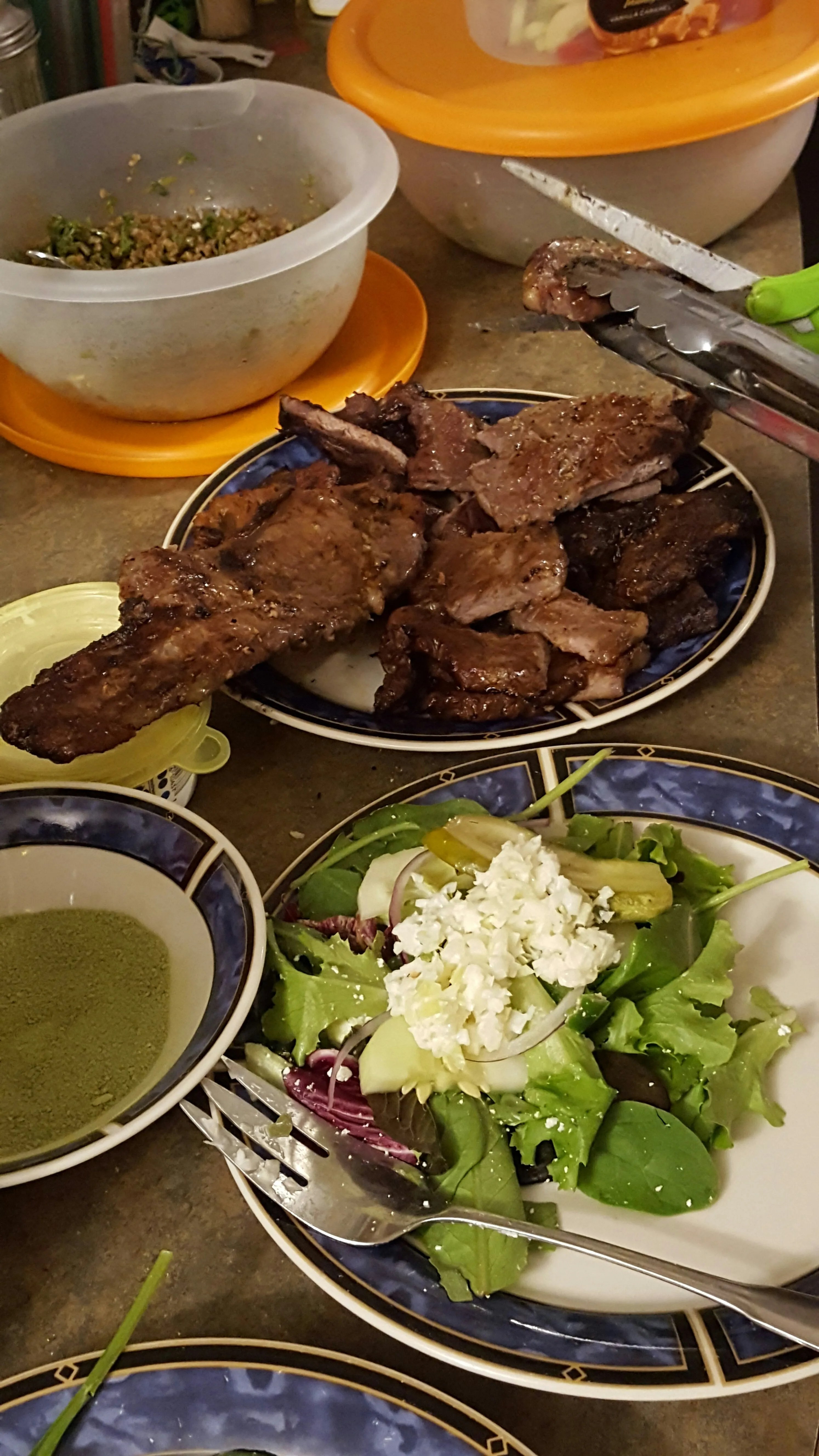 Leafy green salad with coleslaw on the side and a parsley Bulgar salad.