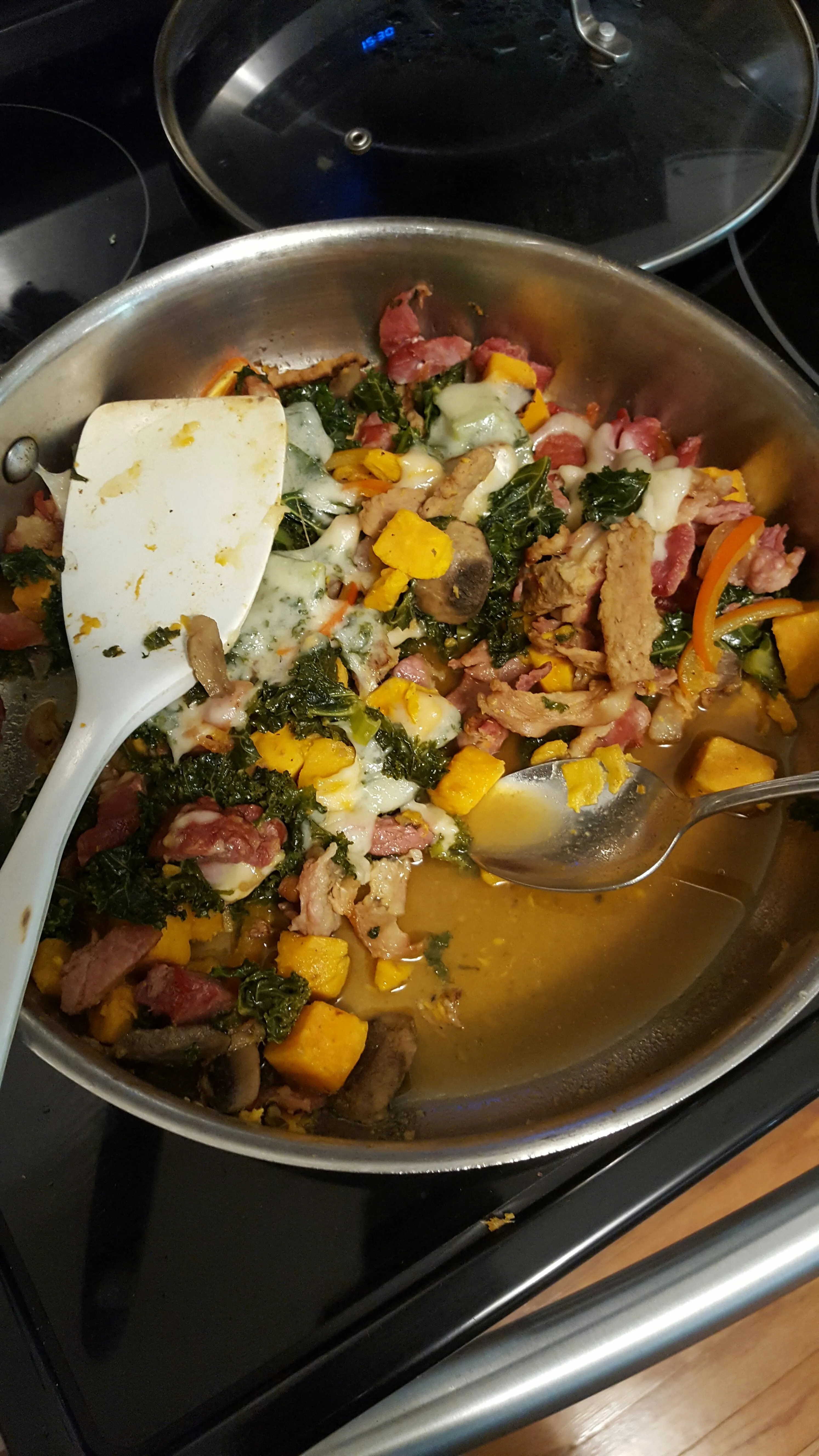 Upstairs my father prepared a dish of oven baked Black Cod with potatoes and lightly fried garden vegetables.